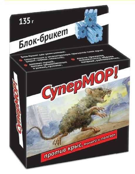 Характеристика: высокоэффективное средство борьбы с мышевидными грызунами - достаточно однократного поедания. Обладает высокой привлекающей способностью для крыс и мышей. Активно даже в отношении грызунов, не чувствительных к другим ядам. Вызывает удушье мышей и крыс - гибель наступает, как правило, на открытых местах, а не в норах. Приманка не вызывает отпугивающего действия и настороженности других особей, т.к. гибель грызунов п